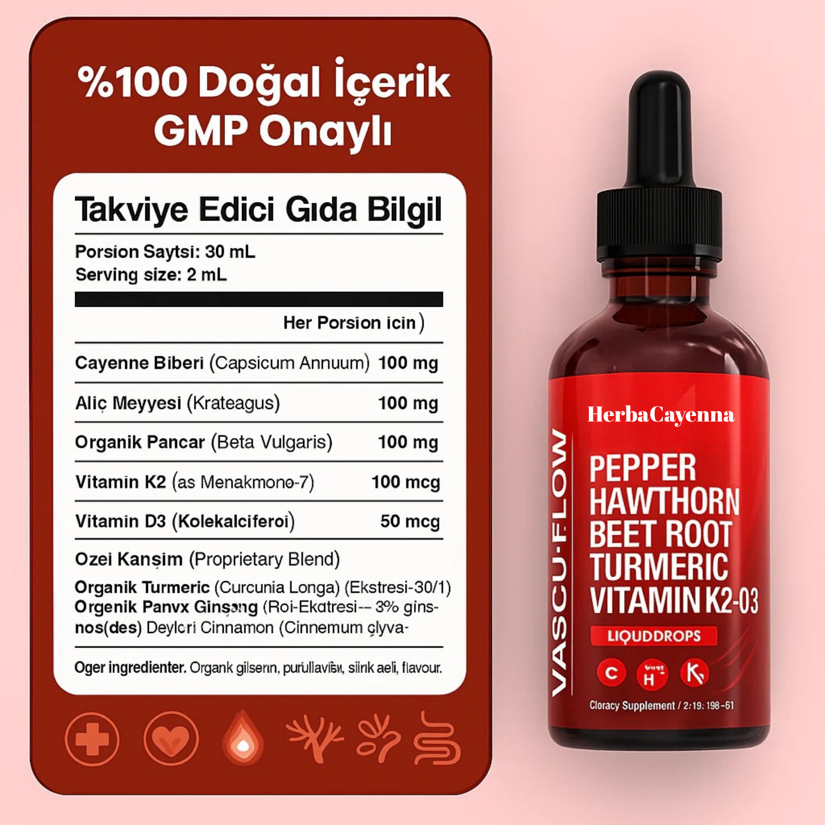 HerbaCayenne; cayenne biberi, alıç, pancar ve zerdeçal özleriyle damarlarınızı destekler, kan akışını hızlandırır.